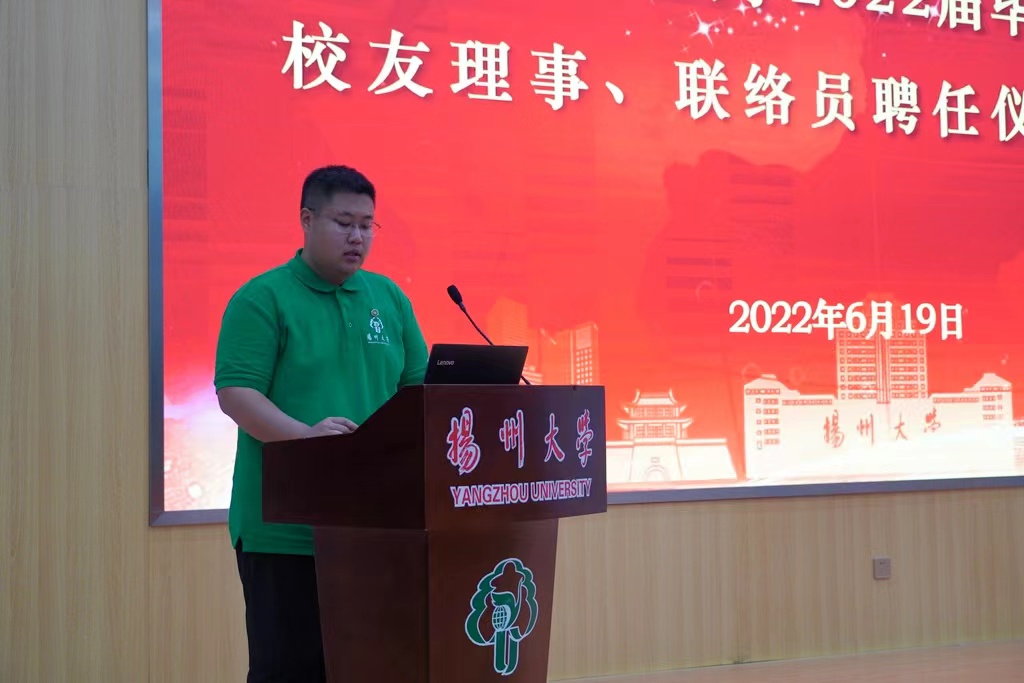 2022届校友联络员赵天海同学发言,他代表418名校友联络员表示将时刻牢记校友工作的重要性,以强烈的责任感和光荣的使命感,促进校友与校友、校友与母校之间沟通和联络,成为服务校友、做好校友工作不可或缺的中坚力量。