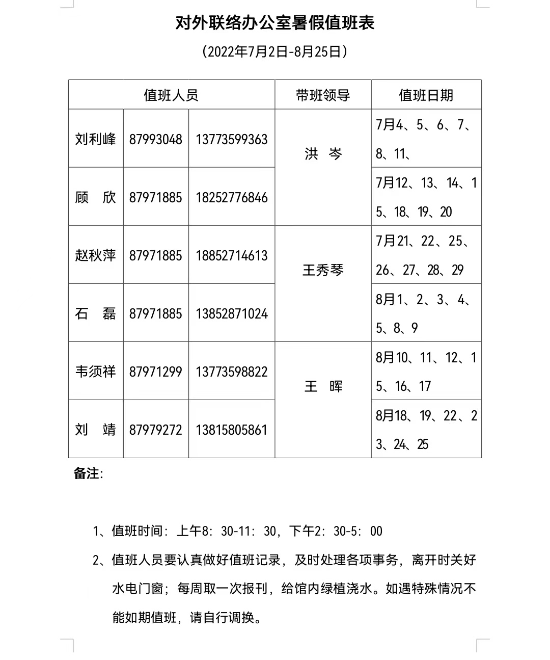 对外联络办公室2022年暑假值班表