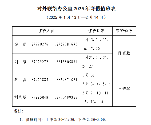 对外联络办公室2025年寒假值班表