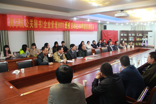 2014年4月19日,商学院公关秘书(企业管理)9111班24位校友返校举行毕业20周年座谈会,商学院党委书记谢科进、副书记孟益宏等领导和老师出席座谈会。会上,谢科进书记向校友们介绍了学院发展情况并向校友们赠送了校友徽章和《商学院校友通讯录》,校友们交流了各自工作和生活情况,并向母校赠送价值6000多元的立式漆器屏风,以表达对母校的感激之情。