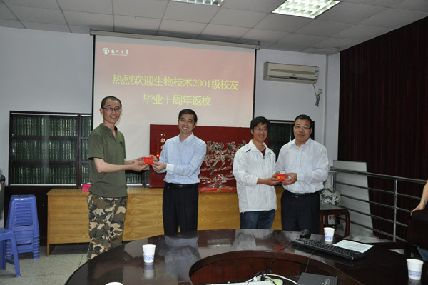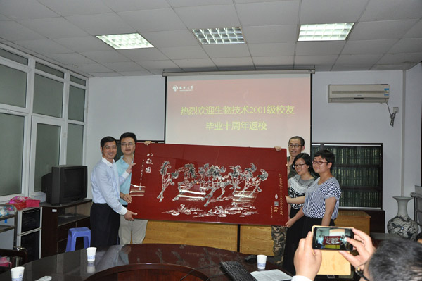 2015年5月23日至24日,生物科学与技术学院生技2001级校友毕业十周年返校聚会,院党委书记孙云寿、副书记王汉林、副院长潘志明,以及班主任、辅导员、部分任课老师应邀参加活动。