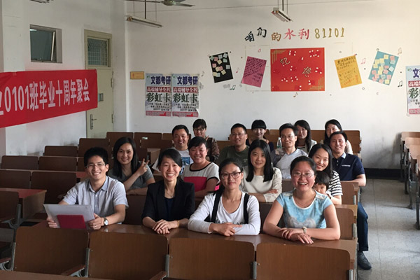2015年5月16日,一早来到学校的同学就在校园内拉起了“十年沧桑情依旧,桃李携手恩师情”的大横幅,开始了当天的接待组织工作。当天下午,参加聚会的同学纷纷到来,大家在5号楼208教室内聚首,开始愉快地进行畅谈。
