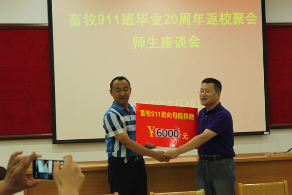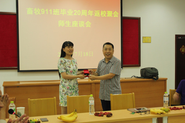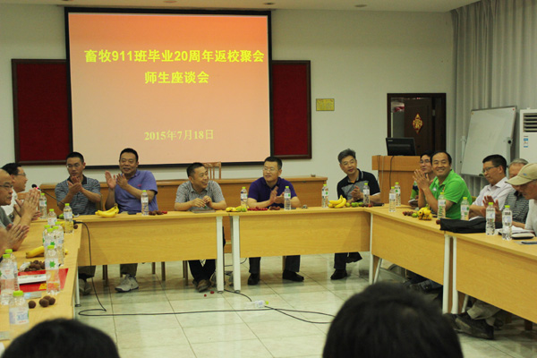 2015年7月18日下午,动物科学与技术学院立华报告厅欢声笑语、气氛热烈,畜牧专业91级1班毕业20周年聚会师生座谈会在这里举行。