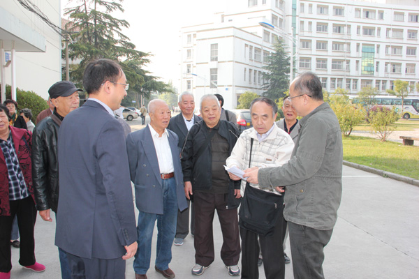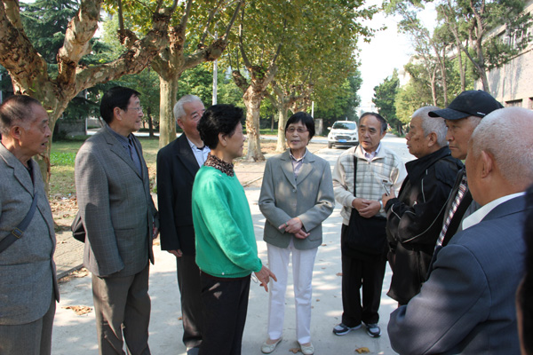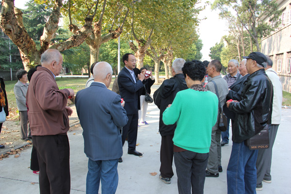 2015年10月13日,原扬州工业专科学校水5908班的校友们在毕业56周年之际,于常州聚会后回到阔别已久的母校,重游故园,感受母校的发展巨变。校友总会秘书长王庆林、副秘书长王志健,环境科学与工程学院院长何成达陪同参观校园,并在当天上午帮助联系到班主任陈芹芬老师与校友们相见,畅叙师生情意。