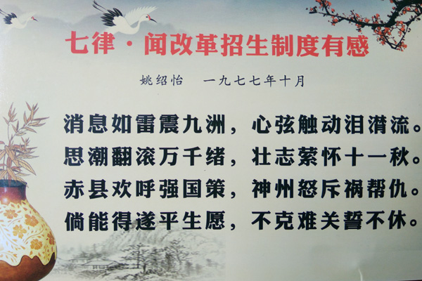 师生们都非常珍惜这次很有意义的特殊聚会,50多位师生济济一堂,回忆往事,大家感慨万分、激动不已。大家都非常感恩于党的改革开放、教育政策好,是党和祖国母亲给了他们参与高考、改写人生、实现自我价值的机会。谈到深处,姚绍怡校友更是激动得热泪盈眶,他是1966年的高中毕业生,因为高考曾经两个夜晚彻夜未眠,一次是他于1966年6月18日听到取消高考制度消息时,失望、迷茫和伤心使她彻夜难眠;另一次是他于1977年10月21日听到恢复高考消息时,激动、高兴和兴奋令她彻夜未眠,他还连夜赋诗一首《七律·闻改革招生制度有感》:“消息如雷震九州,心弦触动泪潸流。思潮翻滚万千绪,壮志萦怀十一秋。赤县欢呼强国策,神州怒斥祸帮仇。倘能得遂平生愿,不克难关誓不休。”座谈会上,大家心潮澎湃、思绪万千,回想起事业的成功和家庭的幸福,无不感谢党的政策暖人心……