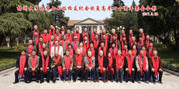 2017年3月26日,来自国内和美国的化学专业77级40多名校友相聚母校,举行纪念恢复高考40周年师生联谊会。化学化工学院党委书记周建兵、院长薛怀国以及部分老教师应邀出席联谊会,对校友们返校聚会表示热烈欢迎,并向校友们介绍了校院在综合竞争力、教学科研、师资队伍、办学条件、人才培养等方面所取得的成就和未来发展规划。