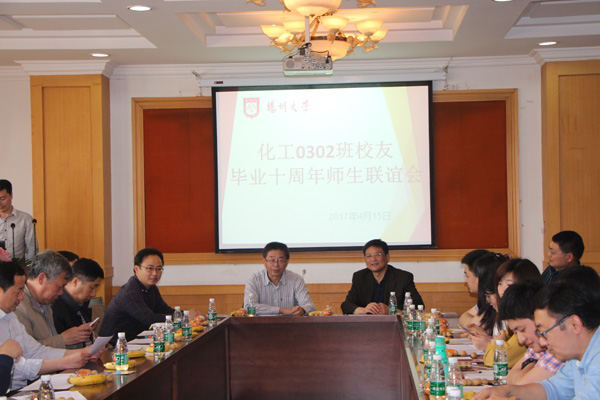 2017年4月15日下午,化工0302班30多名校友相聚母校,举行毕业10周年师生联谊会,胡效亚副校长,化学化工学院党委书记周建兵等领导、老师应邀出席联谊会。师生济济一堂,共叙师生情、同学谊。