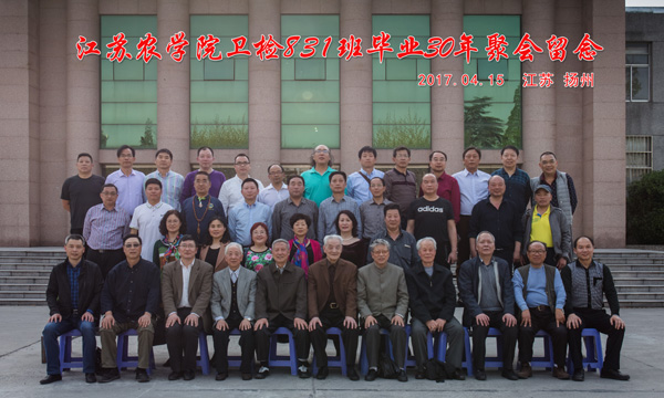 2017年4月13日,原江苏农学院卫检831班校友返回母校举行毕业30周年聚会活动。来自美国和全国各地的卫检831班校友回到阔别已久的母校,师生们欢聚一堂,共叙母校情、师生情、同学情。兽医学院党委书记蔡丽娅、副院长彭大新、办公室主任高红明,校友总会副秘书长王志健,当年的任课老师应邀参加活动。校友们漫步在美丽的校园,抚今追昔,在曾经学习生活的校园里留影纪念。