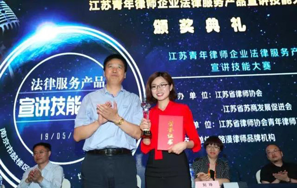据悉,江苏青年律师企业法律服务产品宣讲技能大赛由江苏省律师协会、江苏省苏商发展促进会、江苏省律师协会青年律师工作委员会与路漫律师品牌机构联合举办。历时6个月,横跨全省13个地级市。32名优秀青年律师,经23万网友互动投票,最终10名青年律师参赛选手晋级决赛。经过激烈角逐,评选出一等奖1人、二等奖3人、三等奖6人,最终我校校友、江苏三法律师事务所律师陆嬿池荣获一等奖。