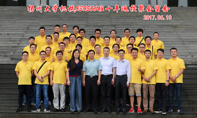 2017年6月10日,机械0305、0306班的校友们重聚母校,举办毕业十周年返校聚会活动。机械工程学院副院长龚俊杰、党委副书记虞强,校友总会副秘书长王志健,原机械工程学院团委书记、现外国语学院党委副书记崔益军,原班主任、现文学院党委副书记张平出席相关活动。