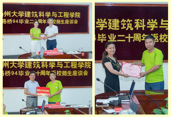 座谈会上,王志健向校友们颁发了校友徽章并介绍了学校校友会建设情况。王晖、康爱红向校友们介绍了学院近年来各方面的发展情况。在本次返校活动中,路桥94校友在学院捐资设立了“路桥94大学生科创基金”,徐福中校友受聘为学院大学生就业创业导师。