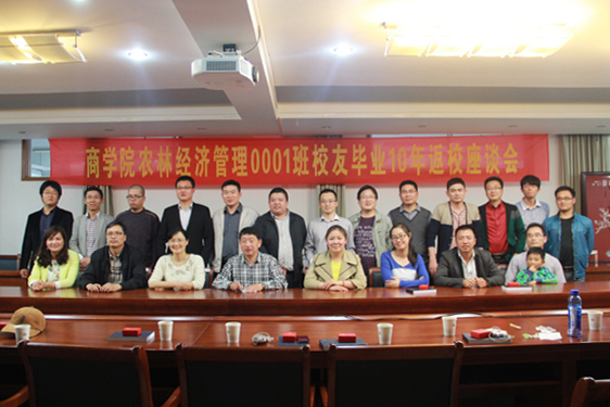 2014年5月10日,商学院农林经济管理0001班26位校友返校举行毕业10周年座谈会,商学院党委书记谢科进、副书记孟益宏等领导和老师出席座谈会。会上,谢科进向校友们介绍了学院发展情况并向校友们赠送了校友徽章和《商学院校友通讯录》,校友们交流了各自工作和生活情况。庄美进校友与农林经济管理专业的在校学生分享了其在校学习及工作后的体会。