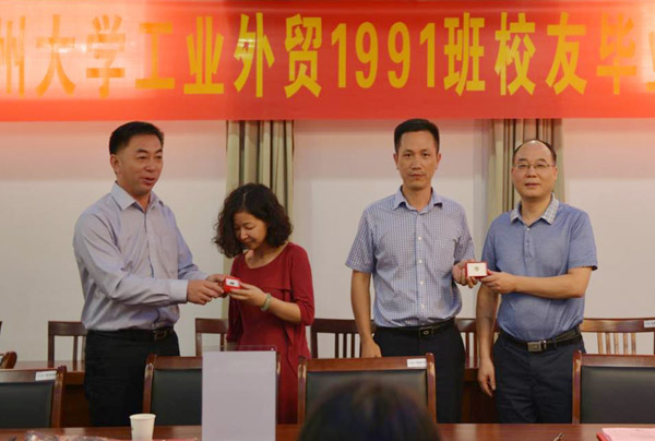 为表达对母校的感恩与祝福,工业外贸1991班全体同学向母校捐赠3000元,在江阳路北校区老教学主楼前认捐了一棵雪松,并在认捐纪念石上刻下了全体同学的心声和对母校的寄语:“忆往昔,格物致知,岁月如歌致青春!看今朝,厚德抱朴,激情似火铸辉煌!”。在商院座谈会上,王志健向校友代表颁发了《捐赠荣誉证书》。