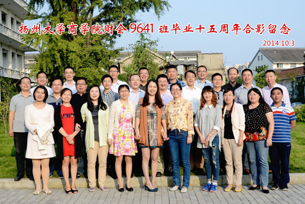 2014年10月3日,商学院财9641班校友在毕业15年后又相约母校聚会。校友们参观了商学院老校区,回忆大学往事,并拍照合影留念。班主任刘佳老师应邀参加聚会活动,她受校友会委托向每位校友颁发扬州大学校友徽章。在聚会交流中,“我们爱你可爱的母校——扬州大学”是已毕业15年的财9641班全体学子的共同心声。