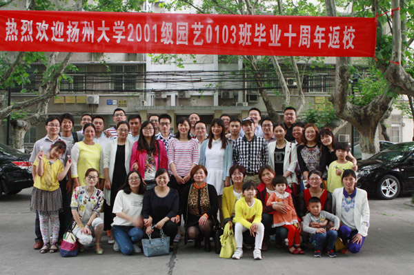 流火的五月,激情的五月,迎来了园艺与植物保护学院园艺0103班毕业十周年返校的校友们。2015年5月23日,校友欢聚校园,畅叙友谊,相互祝福,共同缅怀大学求学的美好时光。为母校十年来取得的成就感到由衷高兴,为成为扬大的校友感到自豪。同学们相互鼓励,争取在各自工作中取得更大的成绩,回报社会,回报母校。两天的相聚很快结束了,大家依依不舍地踏上了各自的人生征程,相约二十年再会。