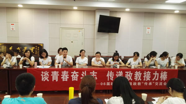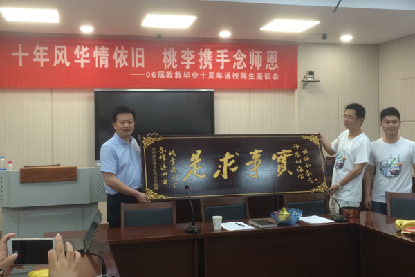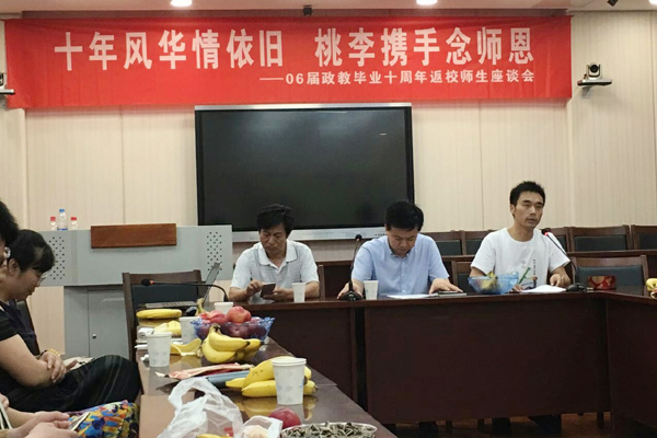 2016年7月2日,马克思主义学院思想政治教育专业2006届校友毕业10周年返校聚会在文汇路校区举行。近30名校友回到阔别十载的母校,与在校师生开展了“十年风华情依旧,桃李携手念师恩”为主题的师生座谈,回忆同窗往事,畅谈人生感悟,马克思主义学院党委书记吴荣军、院办副主任陈进、2002级政教班班主任程海霞老师、陈鹤玲老师、原辅导员华南老师等出席了师生座谈会。