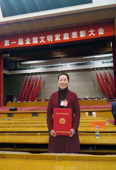 据悉,此次全国共评选出300户“全国文明家庭”,浙江省仅有10个家庭入围,陈淑芳家庭是宁波市唯一的入选家庭。会上,陈淑芳校友作为浙江省获得“全国文明家庭”荣誉的家庭代表上台接受表彰。
