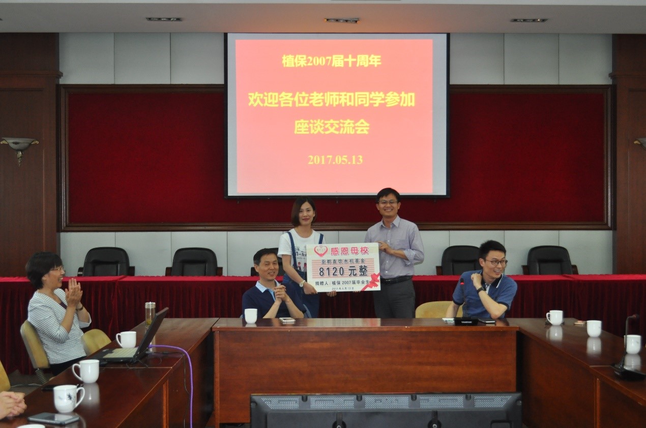 当天下午,在荷花池校区行政楼一楼会议室,师生们进行了热烈的交流。各位校友向母院老师汇报了个人的工作学习生活情况,他们有的就职于各级植保相关事业单位,有的已经成为高校教师,有的自主创业成为公司老板,家庭、事业均有所成。祝树德、杜予州、童蕴慧、徐建祥、袁树忠、刘井兰、陈夕军、施林峰、赵明等老师给校友们带来了师长的祝福,对大家的发展提出殷切的希望,并希望同学们常回家看看。周超介绍了学院近几年的发展情况,校友们对母院这些年取得的成绩感到由衷喜悦和骄傲。校友会办公室负责人向校友们赠送了校友徽章,希望各位校友一如既往地关注母校发展。随后,参加聚会的同学共同向学院捐赠了一台亚都直饮机。