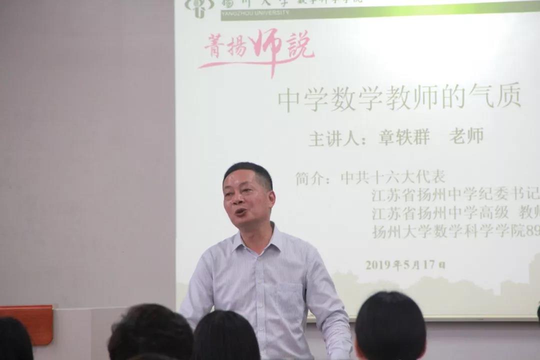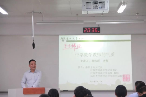 气质是每个人相对稳定的个性特点和风格气度,酝酿于内,发之于外,受先天遗传影响,更缘于后天的培养。为了让同学们对中学数学教师的职业气质有更深入的了解,5月17日,数学科学学院邀请到了我校数学教育专业1989届校友、扬州中学纪委书记章轶群来学院作“中学数学教师的气质”专题讲座。学院青年教师代表、17级部分师范生和18级研究生100多人参加了此次讲座。