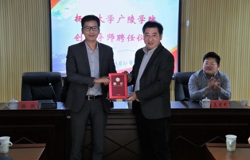 广陵学院举行创业导师聘任仪式暨“心怀感恩砥砺前行”校友分享报告会2019年11月16日,广陵学院在图书馆S1101会议室举行创业导师聘任仪式暨“心怀感恩砥砺前行”校友分享报告会。广陵学院党委副书记虞强、纪委书记刘春秋,我校金融专业2008届校友、朗珍堂(上海)生物科技有限公司总经理徐政,法学专业2002届校友、杭州汇声视听科技有限公司总经理盖建民,机械专业2010届校友、中新软件(上海)有限公司实施经理李啸海等应邀出席仪式。虞强主持活动。聘任仪式上,刘春秋为徐政颁发了“扬州大学广陵学院创业导师”聘书。