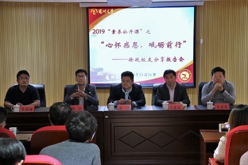 随后,徐政为在座同学作了题为“心怀感恩 砥砺前行”分享报告。报告中,他以自身始终对国家社会、母亲、母校和老师、太太和家庭怀有“感恩之心”来阐述“信仰”,以真诚、平实、诙谐的语言讲述自己如何从一个北漂成为上市公司销售经理、再到自主创业的艰辛历程,鼓励同学们要多维度开拓视野,充分利用好自身资源,勇于承担责任,储备更多能力以应对未来的挑战。