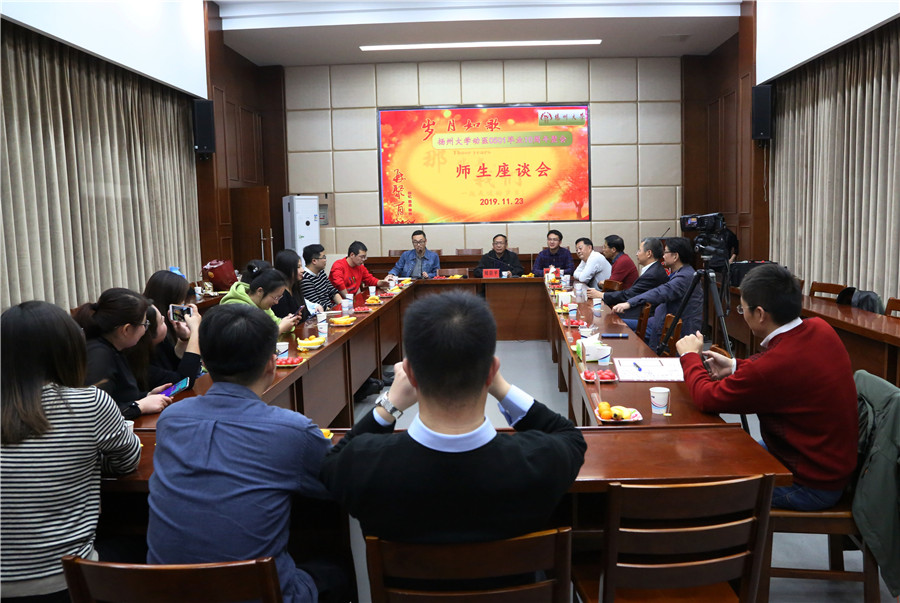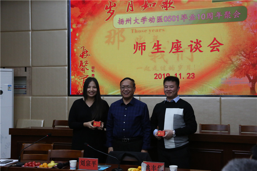 23日下午,师生座谈会在扬州大学文汇路校区兽医学院大楼二楼报告厅举行。兽医学院院长刘宗平,时任班主任王捍东、辅导员姚丰华,以及时任专业课老师孙怀昌、李建基、卜仕金、卞建春、刘学忠、王亨等应邀出席活动。老师和同学们欢聚一堂,讨论交流气氛热烈,仿佛又回到当年的课堂,聆听老师们的谆谆教诲。