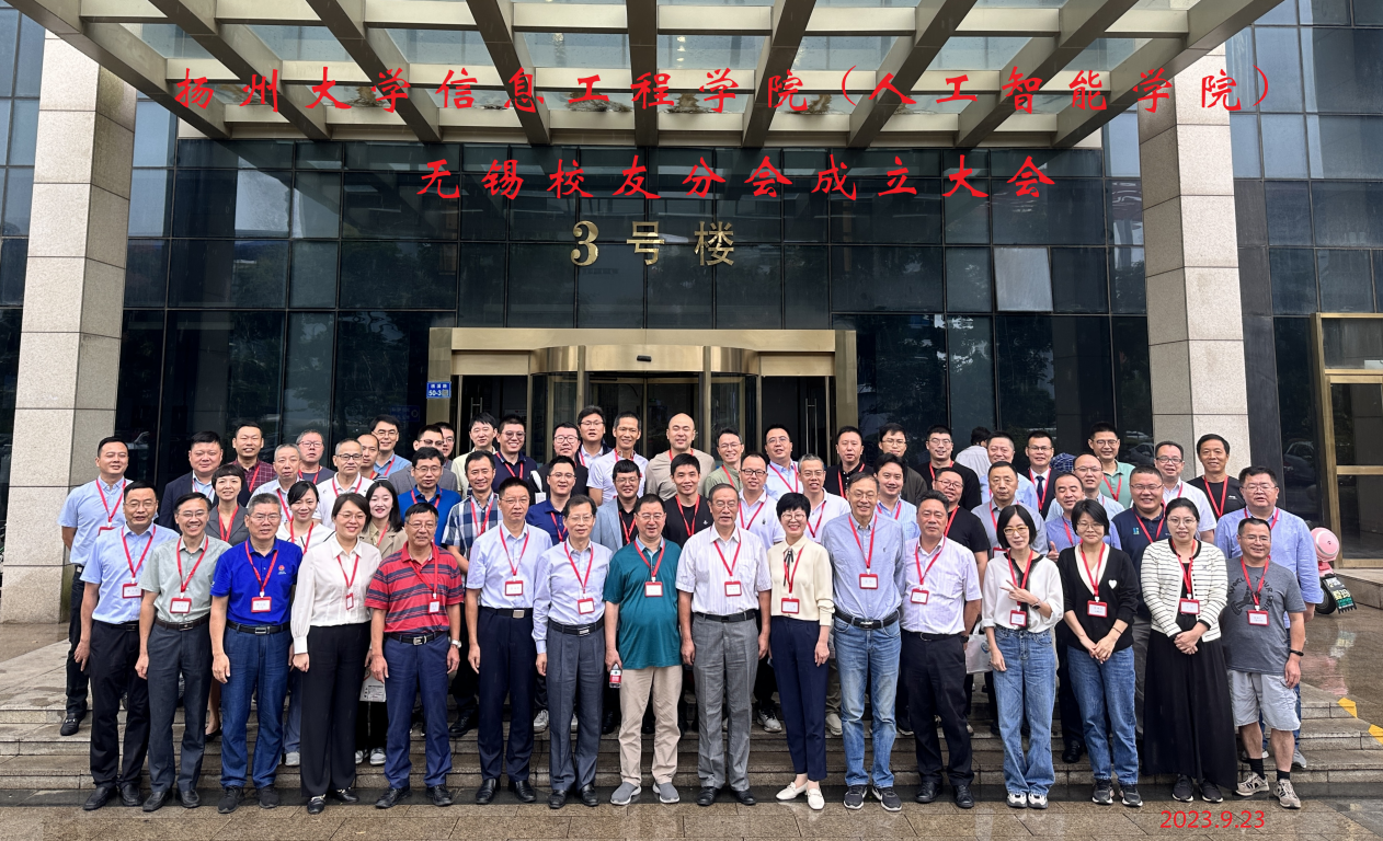2023年9月23日,扬州大学校友会信息工程学院(人工智能学院)无锡校友分会成立仪式在无锡举行。扬州大学原副校级调研员钱晓勤,对外联络办公室(校友会、董事会、教育基金会办公室)五级职员蒋鸿青,信息工程学院党委书记吕红梅、原院长李斌、党委副书记崔益军以及无锡校友代表、有关兄弟校友分会代表等60余人参加活动。会议由陈晓龙校友主持。
