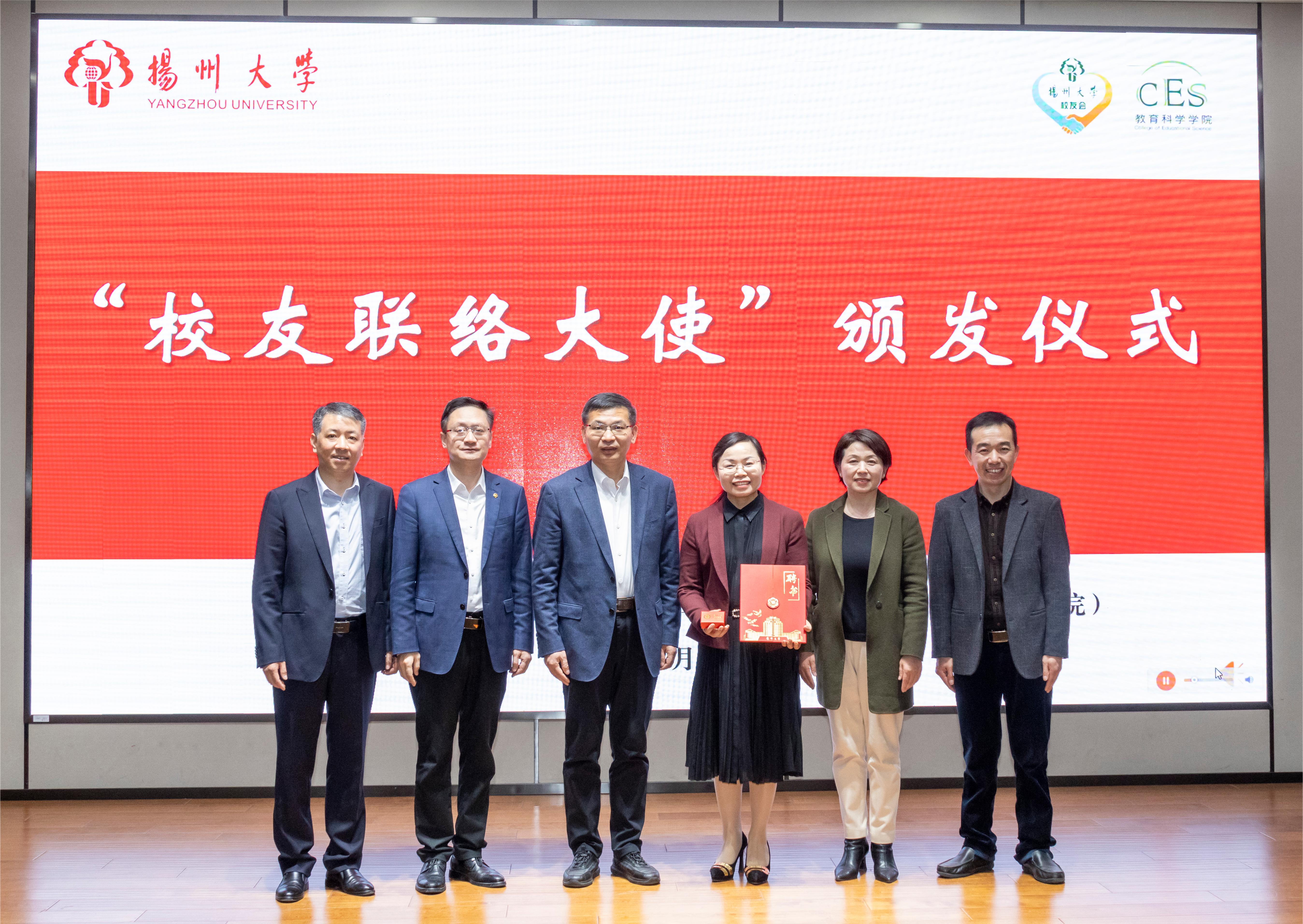刘巧泉向庄惠芬颁发校友徽章、校友联络大使聘书。