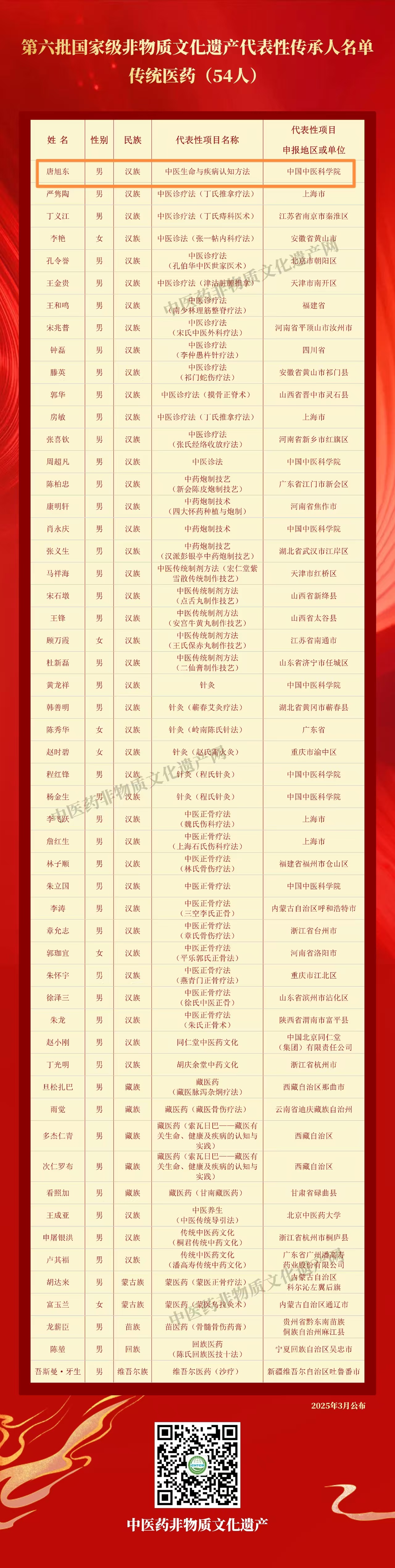 日前,文化和旅游部正式公布第六批国家级非物质文化遗产代表性传承人名单,我校中医专业1982届校友、中国中医科学院西苑医院脾胃病研究所所长唐旭东入选传统医药类国家级非物质文化遗产代表性传承人名单(共54人)。截至目前,传统医药类国家级非物质文化遗产代表性传承人共184人。