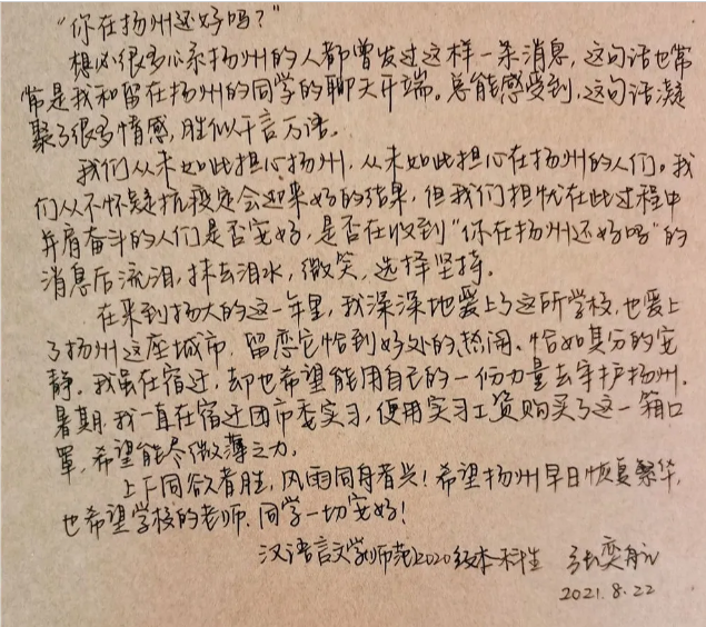 “你在扬州还好吗?这句话常常是我和留在扬州同学的聊天开端,这句话凝聚了很多情感,胜过千言万语……希望扬州早日恢复繁华,也希望学校的老师、同学一切安好。”8月23日,我校文学院汉语言文学师范专业的2020级本科生张奕航同学,从家乡宿迁为学校寄来1200个口罩以及一封盛满深情的信。即使仅在扬大度过一年时光,正如她信上所言:“我深深地爱上了这所学校,也爱上了扬州这座城市。”这何尝不是每一位扬大人的心声?张奕航同学用暑期在宿迁市团委实习的工资所购买的这一箱口罩,于她而言是自己的“绵薄之力”,却在许多人心中掀起阵阵波澜。