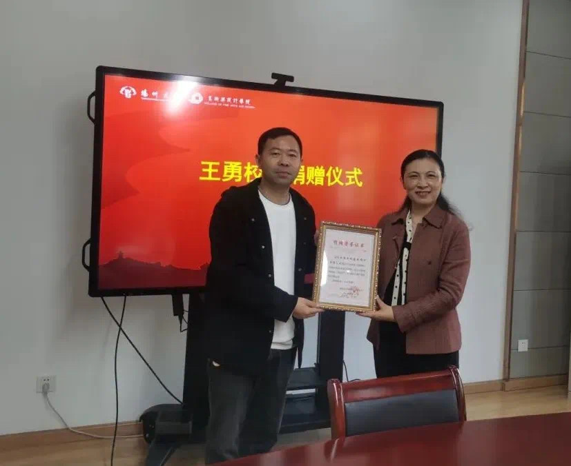 11月21日下午,美术与设计学院王勇校友捐赠暨客座教授聘任仪式在江阳路南校区举行。学院党委书记李向阳、院长李玫,王勇校友,扬州大学教育发展基金会副秘书长王秀琴,学院党委副书记周锋等出席仪式。仪式由李向阳主持。