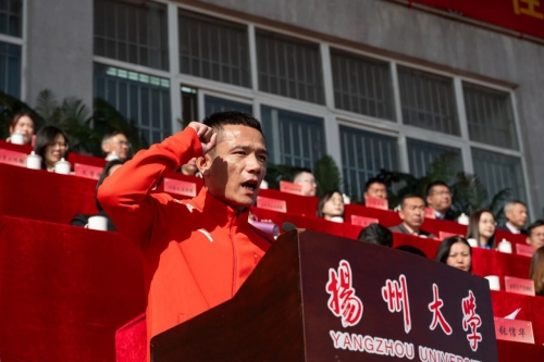 开幕式上,田径国家健将运动员、校高水平田径运动队教练张俊代表全体裁判员宣誓。田径国家一级运动员、两届全国大学生田径锦标赛冠军获得者、体育学院池宣代表全体运动员宣誓。教职工代表、体育学院及扬子津校区10个学院的学生、扬大幼儿园的足球宝贝们,为广大师生带来了“聚力扬大,共耀共荣”大型团体操表演。