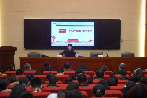 周琴指出,党的十九大报告是中国特色社会主义进入新时代的政治宣言,是决胜全面建成小康社会的行动纲领。报告最鲜明的特点就是博、大、精、深。要认真学习、深刻领会党的十九大精神,始终不渝以习近平新时代中国特色社会主义思想为指导,始终不渝地坚持和改善党的领导,始终不渝地推进党的建设新的伟大工程,始终不渝地增强政治定力、纪律定力、道德定力、抵腐定力。凝心聚力,开拓进取,为建成国内一流、国际知名、特色鲜明的高水平研究型大学而努力奋斗。她要求,我们要始终坚持以人为本,坚持内涵强校,坚持服务需求,坚持开拓创新,坚持全面从严治党,积极抢抓机遇,勇于应对挑战,清醒认识学校发展面临的考验,将“五大战略”、“七大工程”落到实处,从而实现师资队伍质态更佳、人才培养质量更好、学科建设质效更优、科研创新能力更强、国际合作成果更丰、师生幸福指数更高、内部治理机制更顺、管党治党成效更实的发展目标。