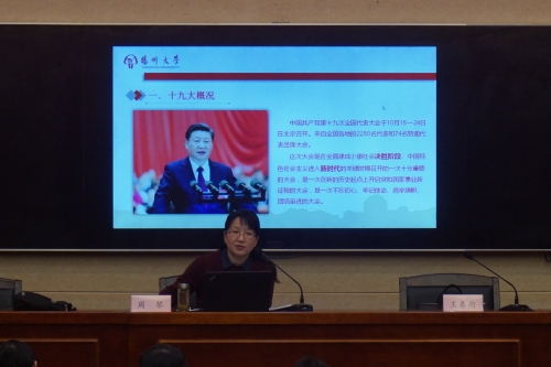 根据校党委统一部署,12月20日下午,校纪委书记周琴在瘦西湖校区数学学院报告厅,为纪委办、监察处、对外联络办公室、物理科学与技术学院、美术与设计学院的师生党员,作题为“不忘初心,牢记使命”党的十九大精神宣讲报告。