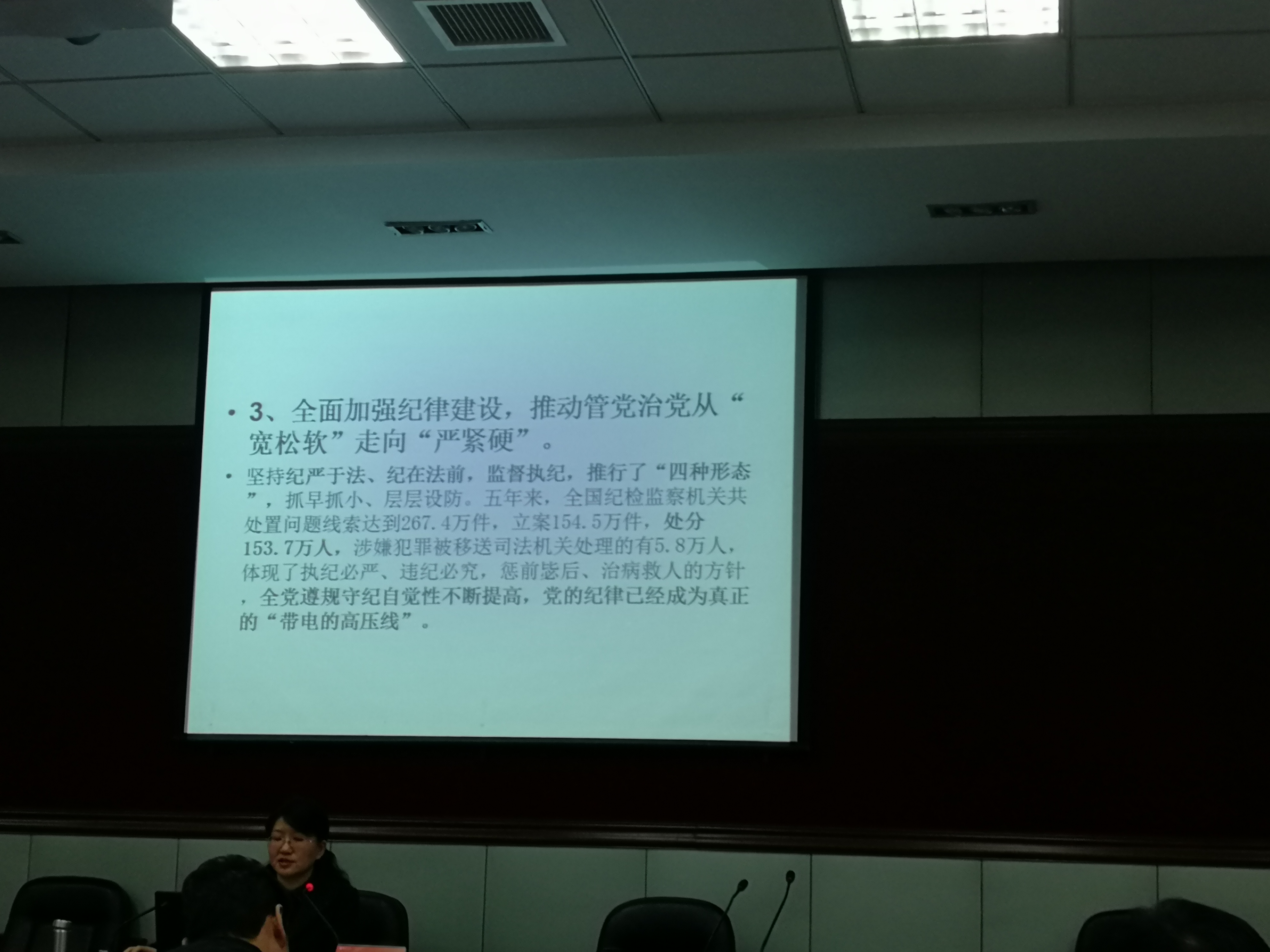 12月19日,根据学校安排,校纪委书记周琴为行政总支党员上了题为《坚持全面从严治党,严守纪律规矩底线》党课。