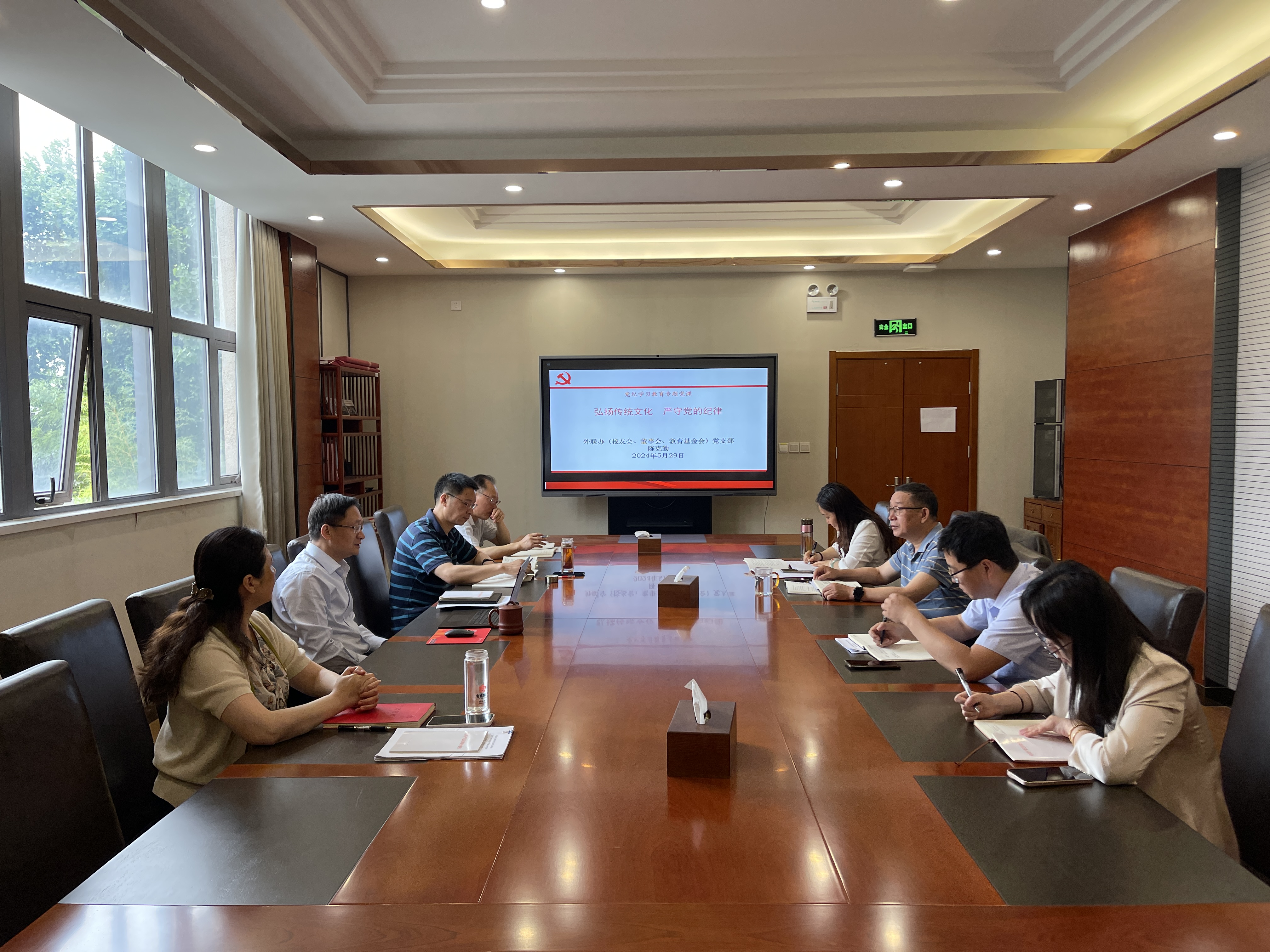 5月22日,外联办(校友会、董事会、教育发展基金会办公室)党支部召开党纪学习教育集中学习会,党支部书记陈克勤以《弘扬传统文化、严守党的纪律》为题,为支部全体党员上了一堂专题党课。他围绕中华传统文化和全面从严治党的关系,结合自身学习思考和工作实际详细阐述了党纪学习教育的重大意义,从恪守六大纪律入手,对如何做到学纪知纪明纪守纪进行了讲解。