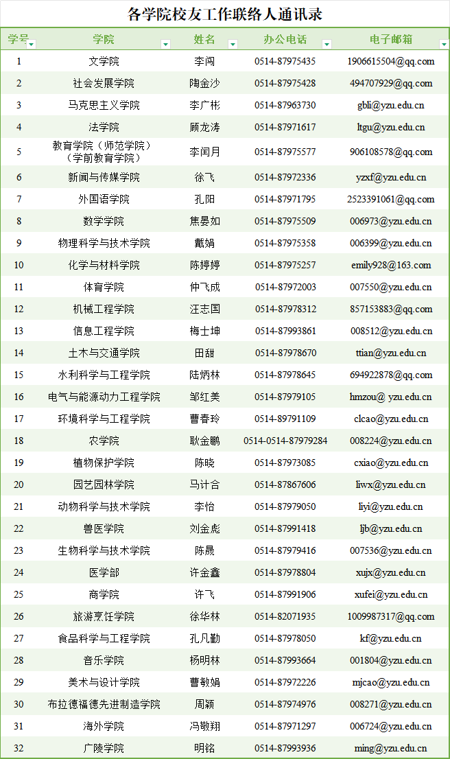 请校友返校、聚会活动联系人请访问扬州大学校友会微信公众号,登录“服务大厅”填写相关信息,我们将为校友返校、聚会活动提供热情周到的服务。